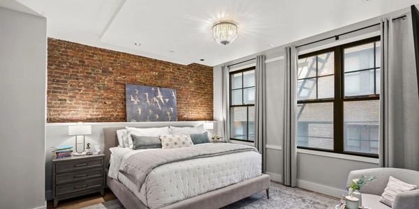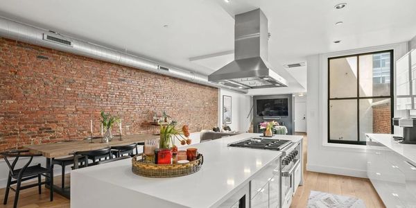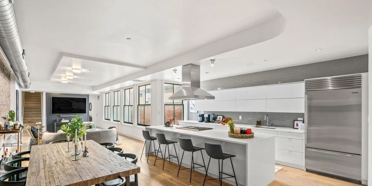 The open-concept floor plan is ideal for entertaining featuring high ceilings, exposed brick walls, oversized windows, and a chic loft-style vibe. The fabulous gourmet kitchen features premium stainless steel appliances including a Wolf range with an upgraded hood, a Sub-Zero refrigerator, wine cooler and an oversized island with ample seating for 4.